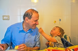 amore, tenerezza tra nonno e nipotino., Nonno ora ti do io da mangiaredi