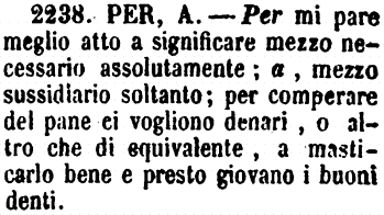 | Per, A - Per mi pare meglio atto a significare mezzo necessario assolutamente; a, mezzo sussidiario soltanto; per comperare del pane ci vogliono denari, o altro che di equivalente, a masticarlo bene e presto giovano i buoni denti. [immagine] |