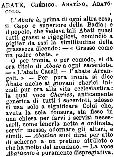 Abate, Cherico, Abatino, Abatucolo - L'Abate è, prima di ogni altra cosa, il Capo e superiore della Badía; e il popolo, che vedeva tali Abati quasi tutti grassi e rigogliosi, cominciò a pigliar da essi la similitudine della grassezza dicendo: - «Grasso come un padre abate.»