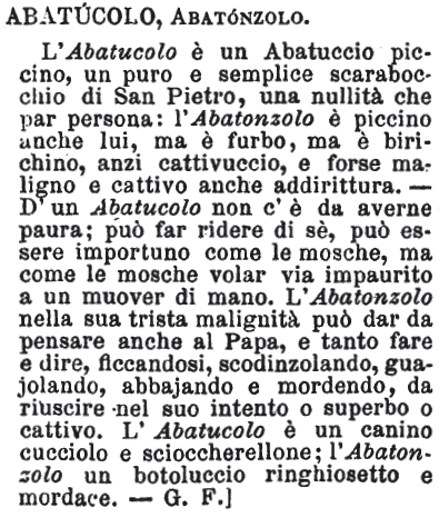 | Abatucolo, Abatonzolo - L'Abatucolo è un Abatuccio piccino, un puro e semplice scarabocchio di San Pietro, una nullità che par persona: l'Abatonzolo è piccino anche lui, ma è furbo, ma è birichino, anzi cattivuccio, e forse maligno e cattivo anche addirittura. - D'un Abatucolo non c'è da averne paura; può far ridere di sè, può essere importuno come le mosche, ma come le mosche volar via impaurito a un muover di mano. L'Abatonzolo nella sua trista malignità può dar da pensare anche al Papa, e tanto fare e dire, ficcandosi, scodinzolando, guajolando, abbajando e mordendo, da riuscire nel suo intento o superbo o cattivo. L'Abatucolo è un canino cucciolo e scioccherellone; l'Abatonzolo un botoluccio ringhiosetto e mordace. - G. F.] [immagine] |