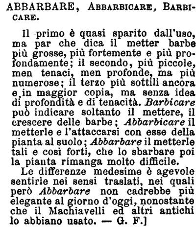 Abbarbare, Abbarbicare, Barbicare - Il primo è quasi sparito dall'uso, ma par che dica il metter barbe più grosse, più fortemente e più profondamente; il secondo, più piccole, men tenaci, men profonde, ma più numerose; il terzo più sottili ancora e in maggior copia, ma senza idea di profondità e di tenacità. Barbicare può indicare soltanto il mettere, il crescere delle barbe; Abbarbicare il metterle e l'attaccarsi con esse della pianta al suolo; Abbarbare il metterle tali e così forti, che lo sbarbare poi la pianta rimanga molto difficile.