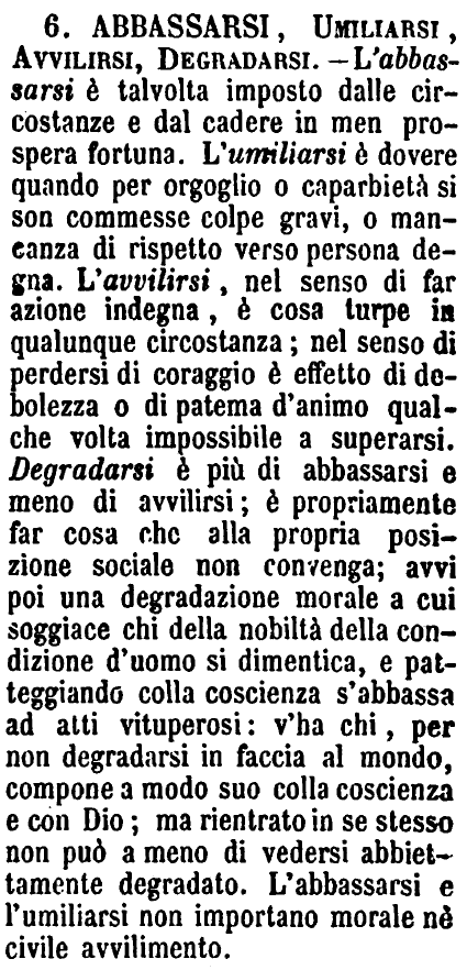 | Abbassarsi, Umiliarsi, Avvilirsi, Degradarsi - L'abbassarsi è talvolta imposto dalle circostanze e dal cadere in men prospera fortuna. L'umiliarsi è dovere quando per orgoglio o caparbietà si son commesse colpe gravi, o mancanza di rispetto verso persona degna. L'avvilirsi, nel senso di far azione indegna, è cosa turpe in qualunque circostanza; nel senso di perdersi di coraggio è effetto di debolezza o di patema d'animo qualche volta impossibile a superarsi. Degradarsi è più di abbassarsi e meno di avvilirsi; è propriamente far cosa che alla propria posizione sociale non convenga; avvi poi una degradazione morale a cui soggiace chi della nobiltà della condizione d'uomo si dimentica, e patteggiando colla coscienza s'abbassa ad atti vituperosi: v'ha chi, per non degradarsi in faccia al mondo, compone a modo suo colla coscienza e con Dio; ma rientrato in se stesso non può a meno di vedersi abbiettamente degradato. L'abbassarsi e l'umiliarsi non importano morale nè civile avvilimento. [immagine] |
