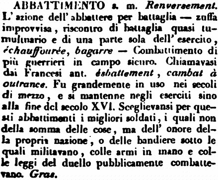 | Abbattimento - s. m. Renversement. L'azione dell'abbattere per battaglia - zuffa improvvisa, riscontro di battaglia quasi tumultuario e di una parte sola dell'esercito, échauffourée, bagarre - Combattimento di più guerrieri in campo sicuro. Chiamavasi dai Francesi ant. ésbattement, cambat à outrance. Fu grandemente in uso nei secoli di mezzo, e si mantenne negli eserciti sino alla fine del secolo XVI. Sceglievansi per questi abbattimenti i migliori soldati, i quali non della somma delle cose, ma dell'onore della propria nazione, o delle bandiere sotto le quali militavano, colle armi in mano e colle leggi del duello pubblicamente combattevano. Gras. [immagine] |