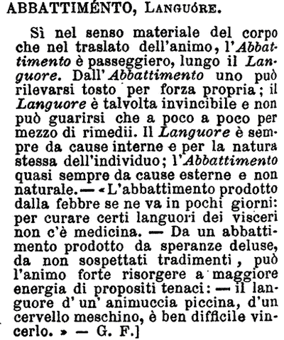 | Abbattimento, Languore - Sì nel senso materiale del corpo che nel traslato dell'animo, l'Abbattimento è passeggiero, lungo il Languore. Dall'Abbattimento uno può rilevarsi tosto per forza propria; il Languore è talvolta invincibile e non può guarirsi che a poco a poco per mezzo di rimedii. Il Languore è sempre da cause interne e per la natura stessa dell'individuo; l'Abbattimento quasi sempre da cause esterne e non naturale. - «L'abbattimento prodotto dalla febbre se ne va in pochi giorni: per curare certi languori dei visceri non c'è medicina. - Da un abbattimento prodotto da speranze deluse, da non sospettati tradimenti, può l'animo forte risorgere a maggiore energia di propositi tenaci: - il languore d'un'animuccia piccina, d'un cervello meschino, è ben difficile vincerlo.» - G. F.] [immagine] |
