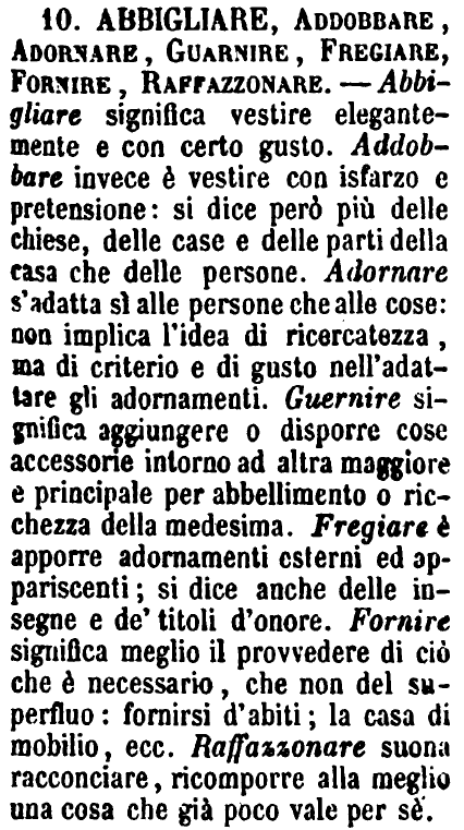| Abbigliare, Addobbare, Adornare, Guarnire, Fregiare, Fornire, Raffazzonare - Abbigliare significa vestire elegantemente e con certo gusto. Addobbare invece è vestire con isfarzo e pretensione: si dice però più delle chiese, delle case e delle parti della casa che delle persone. Adornare s'adatta sì alle persone che alle cose: non implica l'idea di ricercatezza, ma di criterio e di gusto nell'adattare gli adornamenti. Guernire significa aggiungere o disporre cose accessorie intorno ad altra maggiore e principale per abbellimento o ricchezza della medesima. Fregiare è apporre adornamenti esterni ed appariscenti; si dice anche delle insegne e de' titoli d'onore. Fornire significa meglio il provvedere di ciò che è necessario, che non del superfluo: fornisi d'abiti; la casa di mobilio, ecc. Raffazzonare suona racconciare, ricomporre alla meglio una cosa che già poco vale per sè. [immagine] |
