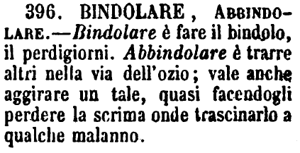 | Bindolare, Abbindolare - Bindolare è fare il bindolo, il perdigiorni. Abbindolare è trarre altri nella via dell'ozio; vale anche aggirare un tale, quasi facendogli perdere la scrima onde trascinarlo a qualche malanno. [immagine] |