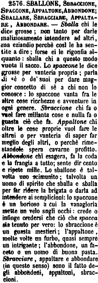 | Sballone, Sbraccione, Spaccone, Appaltone, Abbondone; Sballare, Sbracciare, Appaltare, Abbondare - Sballa chi le dice grosse; non tanto per darle maliziosamente intendere ad altri, ma eziandio perchè così le ha sentite a dire; forse ei le rigonfia alquanto: sballa chi a questo modo vuota il sacco. Lo spaccone le dice grosse per vanteria propria; parla di sè o de' suoi per dare maggior concetto di sè a chi non lo conosce: lo spaccone vanta fra le altre cose ricchezze e avventure in ogni genere. Sbraccione chi fa o vuol fare millanta cose e nulla fa o guasta ciò che fa. Appaltone chi oltre le cose proprie vuol fare le altrui o per vanteria di saper far meglio degli altri, o perchè rimestandole spera cavarne profitto. Abbondone chi esagera, fa la coda e la frangia a tutto; sente dir cento e ripete mille. Lo sballone è talvolta uno scimunito; talvolta un uomo di spirito che sballa e sballa per far ridere la brigata o darla ad intendere ai semplicioni: lo spaccone è un borioso a cui la vanagloria mette un velo sugli occhi: crede o infinge credersi che ciò che spacca sia tenuto per vero: lo sbraccione è un guasta mestieri; l'appaltone, molte volte un furbo, quasi sempre un intrigante; l'abbondone, un faceto o un uomo di buona pasta. Sbracciare, appaltare e abbondare (in questo senso) sono il fatto degli abbondoni, appaltoni, sbraccioni. [immagine] |