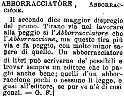 | Abborracciatore, Abborraccione - Il secondo dice maggior dispregio del primo. Tirano via nel lavorare alla peggio sì l'Abborracciatore che l'Abborraccione, ma questo tira più via e fa peggio, con molto minor sapere di quello. Un abborracciatore di libri può scriverne de' possibili e trovar sempre un editore che lo paghi anche bene; quelli d'un abborraccione pochi o nessuno li legge, e guai all'editore, se pur ve n'è di così gonzi. - G. F.] [immagine] |