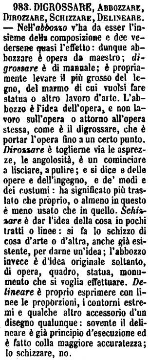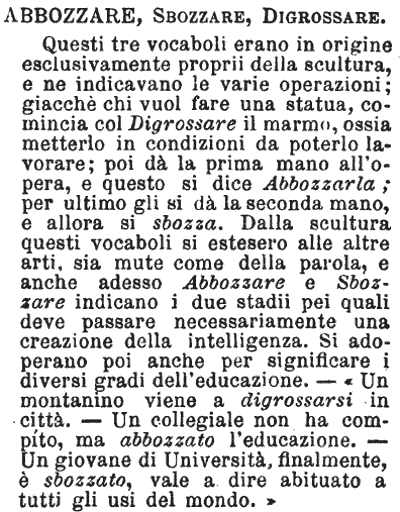 | Abbozzare, Sbozzare, Disgrossare - Questi tre vocaboli erano in origine esclusivamente proprii della scultura, e ne indicavano le varie operazioni; giacchè chi vuol fare una statua, comincia col Digrossare il marmo, ossia metterlo in condizioni da poterlo lavorare; poi dà la prima mano all'opera, e questo si dice Abbozzarla; per ultimo gli si dà la seconda mano, e allora si sbozza. Dalla scultura questi vocaboli si estesero alle altre arti, sia mute come della parola, e anche adesso Abbozzare e Sbozzare indicano i due stadii pei quali deve passare necessariamente una creazione della intelligenza. Si adoperano poi anche per significare i diversi gradi dell'educazione. - «Un montanino viene a digrossarsi in città. - Un collegiale non ha compìto, ma abbozzato l'educazione. - Un giovane di Università, finalmente, è sbozzato, vale a dire abituato a tutti gli usi del mondo.» [immagine] |