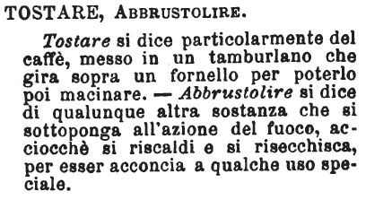 | Tostare, Abbrustolire - Tostare si dice particolarmente del caffè, messo in un tamburlano che gira sopra un fornello per poterlo poi macinare. - Abbrustolire si dice di qualunque altra sostanza che si sottoponga all'azione del fuoco, acciocchè si riscaldi e si risecchisca, per esser acconcia a qualche uso speciale. [immagine] |