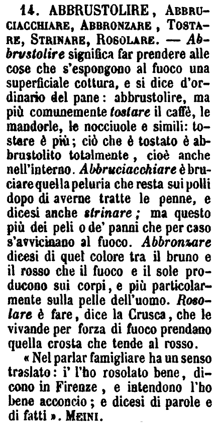 Abbrustolire, Abbruciacchiare, Abbronzare, Tostare, Strinare, Rosolare - Abbrustolire significa far prendere alle cose che s'espongono al fuoco una superficiale cottura, e si dice d'ordinario del pane: abbrustolire, ma più comunemente tostare il caffè, le mandorle, le nocciuole e simili: tostare è più; ciò che è tostato è abbrustolito totalmente, cioè anche nell'interno. Abbruciacchiare è bruciare quella peluria che resta sui polli dopo di averne tratte le penne, e dicesi anche strinare; ma questo più dei peli o de' panni che per caso s'avvicinano al fuoco. Abbronzare dicesi di quel colore tra il bruno e il rosso che il fuoco e il sole producono sui corpi, e più particolarmente sulla pelle dell'uomo. Rosolare è fare, dice la Crusca, che le vivande per forza di fuoco prendano quella crosta che tende al rosso.