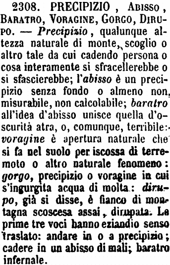 | Precipizio, Abisso, Baratro, Voragine, Gorgo, Dirupo - Precipizio, qualunque altezza naturale di monte, scoglio o altro tale da cui cadendo persona o cosa interamente si sfracellerebbe o si sfascierebbe; l'abisso è un precipizio senza fondo o almeno non misurabile, non calcolabile; baratro all'idea d'abisso unisce quella d'oscurità atra, o, comunque, terribile: voragine è apertura naturale che si fa nel suolo per iscossa di terremoto o altro naturale fenomeno: gorgo, precipizio o voragine in cui s'ingurgita acqua di molta: dirupo, già si disse, è fianco di montagna scoscesa assai, dirupata. Le prime tre voci hanno eziandio senso traslato: andare in o a precipizio; cadere in un abisso di mali; baratro infernale. [immagine] |