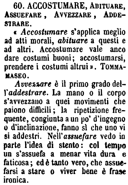 | Accostumare, Abituare, Assuefare, Avvezzare, Addestrare - «Accostumare s'applica meglio ad atti morali, abituare a questi e ad altri. Accostumare vale anco dare costumi buoni; accostumarsi, prendere i costumi altrui». Tommamaseo.