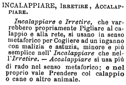 | Incalappiare, Irretire, Accalappiare - Incalappiare e Irretire, che varrebbero propriamente Pigliare al calappio e alla rete, si usano in senso metaforico per Cogliere ad un inganno con malizia e astuzia, minore e più semplice nell'Incalappiare che nell'Irretire. - Accalappiare si usa più di rado nel senso metaforico; e nel proprio vale Prendere col calappio o cane o altro animale. [immagine] |