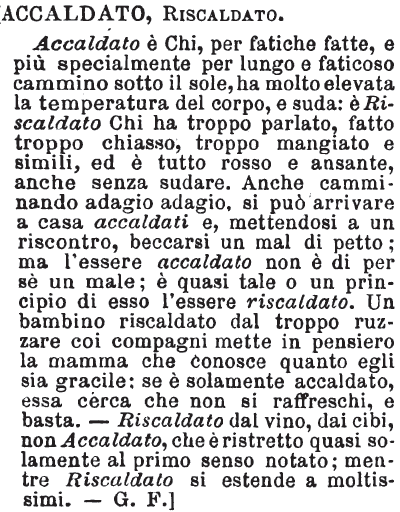| Accaldato, Riscaldato - «Riscaldato dal sole, dal fuoco, o da altro calore artificiale. Ha senso generale ed innocuo e traslati parecchi, Accaldato, nell'uso vivente vale riscaldato assai e tanto da porsi a rischio di pigliare un'imbeccata, un'infreddatura, un mal di punta. Parecchi dialetti d'Italia, per esprimere quest'idea, altra voce non hanno che la generica riscaldato». Tommaseo. [immagine] |