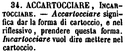 | Accartocciare, Incartocciare - Si accartoccia una cosa dandole forma di cartoccio; si incartoccia mettendola o avvolgendola in un cartoccio. - La carta si accartoccia per incartocciarvi dello zucchero, della farina, ecc. - Una cosa può, piegandosi nel mezzo o sugli orli, accartocciarsi da sè, ma non può mai incartocciarsi se l'uomo non la incartoccia lui. - G. F.] [immagine] |