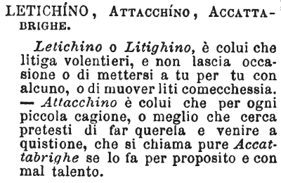 | Letichino, Attacchino, Accattabrighe - Letichino o Litighino, è colui che litiga volentieri, e non lascia occasioni o di mettersi a tu per tu con alcuno, o di muover liti comecchessia. - Attacchino è colui che per ogni piccola cagione, o meglio che cerca pretesti di far querela e venire a quistione, che si chiama pure Attaccabrighe se lo fa per proposito e con mal talento. [immagine] |