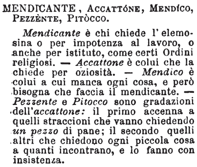 | Mendicante, Accattone, Mendico, Pezzente, Pitocco - Mendicante è chi chiede l'elemosina o per impotenza al lavoro, o anche per istituto, come certi Ordini religiosi. - Accattone è colui che la chiede per oziosità. - Mendico è colui a cui manca ogni cosa, e però bisogna che faccia il mendicante. - Pezzente e Pitocco sono gradazioni dell'accattone: il primo accenna a quelli straccioni che vanno chiedendo un pezzo di pane; il secondo quelli altri che chiedono ogni piccola cosa a quanti incontrano, e lo fanno con insistenza. [immagine] |