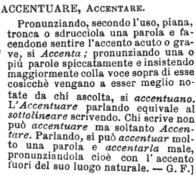 | Accentuare, Accentare - Pronunziando, secondo l'uso, piana, tronca o sdrucciola una parola e facendone sentire l'accento acuto o grave, si Accenta; pronunziando una o più parole spiccatamente e insistendo maggiormente colla voce sopra di esse cosicchè vengano a esser meglio notate da chi ascolta, si accentuano. L'Accentuare parlando equivale al sottolineare scrivendo. Chi scrive non può accentuare ma soltanto Accentare. Parlando, si può accentuar molto una parola e accentarla male, pronunziandola cioè con l'accento fuori del suo luogo naturale. - G. F.] [immagine] |