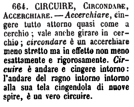 | Circuire, Circondare, Accerchiare - Accerchiare, cingere tutto attorno quasi come a cerchio; vale anche girare in cerchio; circondare è un accerchiare meno stretto ma in effetto non meno esattamente e rigorosamente. Circuire è andare e cingere intorno: l'andare del ragno intorno intorno alla sua tela cingendola di nuove spire, è un vero circuire. [immagine] |
