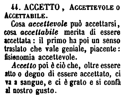 | Usando "accetto" (*) si possono ottenere i seguenti risultati: sacca * = saetto; duca * = ducetto; mica * = micetto; calca * = calcetto; conca * = concetto; cosca * = coscetto; pesca * = pescetto; porca * = porcetto; torca * = torcetto; trinca * = trincetto. |
