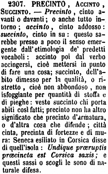 | Precinto, Accinto, Succinto - Precinto, cinto avanti o davanti; o anche tutto intorno; accinto, cinto addosso: succinto, cinto in su: questo sarebbe presso a poco il senso emergente dall'etimologia de' predetti vocaboli: accinto poi dal verbo accingersi, cioè mettersi in punto di fare una cosa; succinto, dell'abito dimesso per la qualità, o ristretto, cioè non abbondoso, non isfoggiante per quantità di stoffa e di pieghe: veste succinto chi porta abiti così fatti; precinto non ha altro significato che precinto d'armatura, o d'altra cosa che difende; città cinta, precinta di fortezze e di mura: Seneca esiliato in Corsica disse di quell'isola: Undique praeruptis praecincta est Corsica saxis; e questi sassi o scogli le sono di naturale difesa. [immagine] |