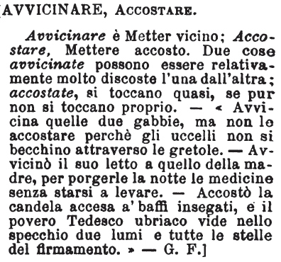 | Avvicinare, Accostare - Avvicinare è Metter vicino; Accostare, Mettere accosto. Due cose avvicinate possono essere relativamente molto discoste l'una dall'altra; accostate, si toccano quasi, se pur non si toccano proprio. - «Avvicina quelle due gabbie, ma non le accostare perchè gli uccelli non si becchino attraverso le gretole. - Avvicinò il suo letto a quello della madre, per porgerle la notte le medicine senza starsi a levare. - Accostò la candela accesa a' baffi insegati, e il povero Tedesco ubriaco vide nello specchio due lumi e tutte le stelle del firmamento.» - G.F.] [immagine] |
