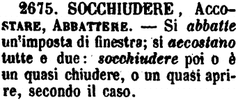 | Socchiudere, Accostare, Abbattere - Si abbatte un'imposta di finestra; si accostano tutte e due; socchiudere poi o è un quasi chiudere, o un quasi aprire, secondo il caso. [immagine] |