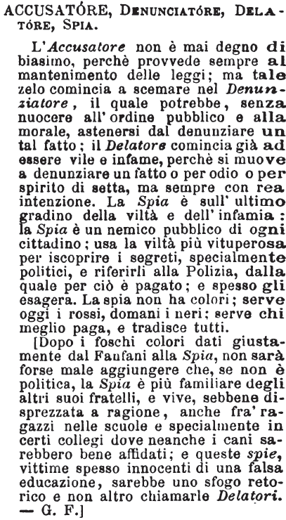 | Accusatore, Denunciatore, Delatore, Spia - L'Accusatore non è mai degno di biasimo, perchè provvede sempre al mantenimento delle leggi; ma tale zelo comincia a scemare nel Denunziatore, il quale potrebbe, senza nuocere all'ordine pubblico e alla morale, astenersi dal denunziare un tal fatto; il Delatore comincia già ad essere vile e infame, perchè si muove a denunziare un fatto o per odio o per spirito di setta, ma sempre con rea intenzione. La Spia è sull'ultimo gradino della viltà e dell'infamia: la Spia è un nemico pubblico di ogni cittadino; usa la viltà più vituperosa per iscoprire i segreti, specialmente politici, e riferirli alla Polizia, dalla quale per ciò è pagato; e spesso gli esagera. La spia non ha colori; serve oggi i rossi, domani i neri; serve chi meglio paga, e tradisce tutti.