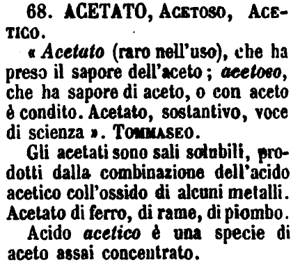 Acetato, Acetoso, Acetico - «Acetato (raro nell'uso), che ha preso il sapore dell'aceto; acetoso, che ha sapore di aceto, o con aceto è condito. Acetato, sostantivo, voce di scienza.» Tommaseo.