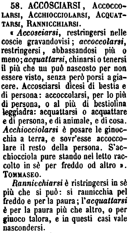 | Accosciarsi, Accoccolarsi, Acchiocciolarsi, Acquattarsi, Rannicchiarsi - «Accosciarsi, restringersi nelle coscie gravandovisi; accoccolarsi, restringersi, abbassandosi più o meno; acquattarsi, chinarsi o tenersi il più che un può nascosto per non essere visto, senza però porsi a giacere. Accosciarsi dicesi di bestia e di persona: accoccolarsi, per lo più di persona, o al più di bestiolina leggiadra: acquattarsi o acquattare e di persona, e di animale, e di cosa. Acchiocciolarsi è posare le ginocchia a terra, e sovr'esse accoccolare il resto della persona. S'acchiocciola pure stando nel letto raccolto in sè per freddo od altro». Tommaseo.