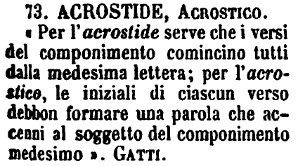 | Acrostide, Acrostico - «Per l'acrostide serve che i versi del componimento comincino tutti dalla medesima lettera; per l'acrostico, le iniziali di ciascun verso debbon formare una parola che accenni al soggetto del componimento medesimo». Gatti. [immagine] |