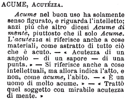 | Acume, Acutezza - Acume nel buon uso ha solamente senso figurato, e riguarda l'intelletto; anzi più che altro dicesi Acume di mente, piuttosto che il solo Acume. L acutezza si riferisce anche a cose materiali, come astratto di tutto ciò che è acuto. - «Acutezza di un angolo - di un sapore - di una punta.» - Si riferisce anche a cose intellettuali, ma allora indica l'atto, e non, come acume, l'abito. - «E' un uomo di molto acume.» - «Trattò quel soggetto con mirabile acutezza di mente.» [immagine] |