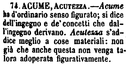 | Acume, Acutezza - Acume ha d'ordinario senso figurato; si dice dell'ingegno e de' concetti che dall'ingegno derivano. Acutezza s'addice meglio a cose materiali: non già che anche questa non venga talora adoperata figurativamente. [immagine] |