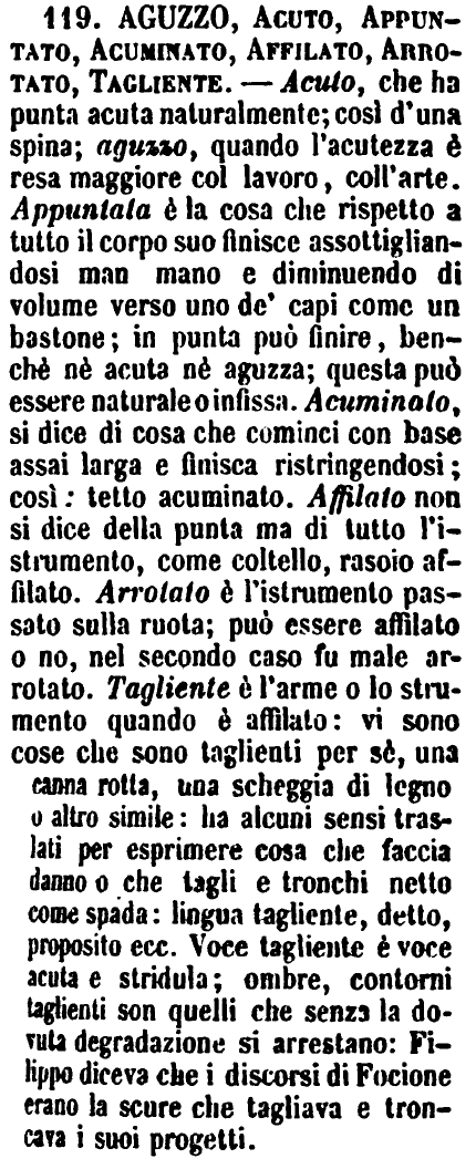 | Acuto, Aguzzo, Appunto, Aguzzare, Appuntare, Acuire - Acuto generalmente è di acutezza naturale, o che tale dev’essere per sua formale qualità. - «Il corno è acuto; acuti sono gli strali; e gli angoli acuti.» - Si dice aguzza quella cosa che è ridotta acuta dall’arte, a che alle volte ha più acutezza che la acuta; e anche la stessa cosa acuta si aguzza per farla più acuta; il qual Aguzzare si usa anche figuratamente, come nell’Aguzzare l’appetito. Di una cosa ridotta in punta si dice che è appuntata; ma quella punta può non essere acuta nè aguzza: la piramide finisce in punta, ma non è acuta nè aguzza. – [Acuire non s’usa che nel traslato. - «Acuire lo sguardo – la vista – l’ingegno – la mente – il desiderio – la passione.» - G. F. ] [immagine] |