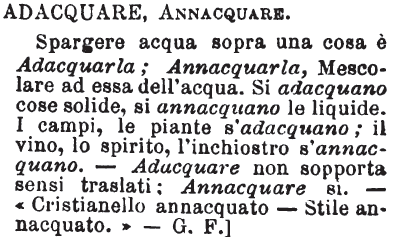 | Adacquare, Annacquare - Spargere acqua sopra una cosa è Adacquarla; Annacquarla, Mescolare ad essa dell'acqua. Si adacquano cose solide, si annacquano le liquide. I campi, le piante s'adacquano; il vino, lo spirito, l'inchiostro s'annacquano. - Adacquare non sopporta sensi traslati: Annacquare si. - «Cristianello annacquato - Stile annacquato.» - G. F. [immagine] |