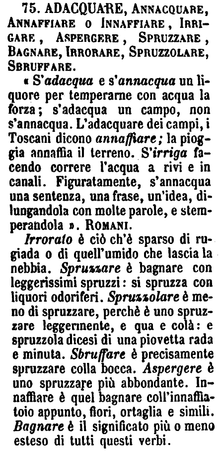 | Adacquare, Annacquare, Annaffiare o Innaffiare, Irrigare, Aspergere, Spruzzare, Bagnare, Irrorare, Spruzzolare, Sbruffare - « S'adacqua e s'annacqua un liquore per temperarne con acqua la forza; s'adacqua un campo, non s'annacqua. L'adacquare dei campi, i Toscani dicono annaffiare; la pioggia annaffia il terreno. S'irriga facendo correre l'acqua a rivi e in canali. Figuratamente, s'annacqua una sentenza, una frase, un'idea, dilungandola con molte parole, e stemperandola ». Romani.