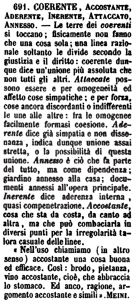 | Coerente, Accostante, Aderente, Inerente, Attaccato, Annesso - Le terre dei coerenti si toccano; fisicamente non fanno che una cosa sola; una linea razionale soltanto le divide secondo la giustizia e il diritto: coerente dunque dice un'unione più assoluta che non tutti gli altri. Attaccate possono essere e per onogeneità ed affetto cose simpatiche; e per forza, cose ancora discordanti o indifferenti le une alle altre: fra le omogenee facilmente formasi coesione. Aderente dice già simpatia e non dissonanza, indica dunque unione assai stretta, o la possibilità di questa unione. Annesso è ciò che fa parte del tutto, ma come dipendenza; giardino annesso alla casa; documenti annessi all'opera principale. Inerente dice aderenza interna, quasi compenetrazione. Accostante, cosa che sta da costa, da canto ad altra, ma che può combaciarla in diversi punti per la irregolarità talora casuale delle linee.