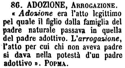| Adozione, Arrogazione - «Adozione era l'atto legittimo pel quale il figlio dalla famiglia del padre naturale passava in quella del padre adottivo. L'arrogazione, l'atto per cui chi non aveva padre si dava nella potestà d'un padre adottivo». Popma. [immagine] |