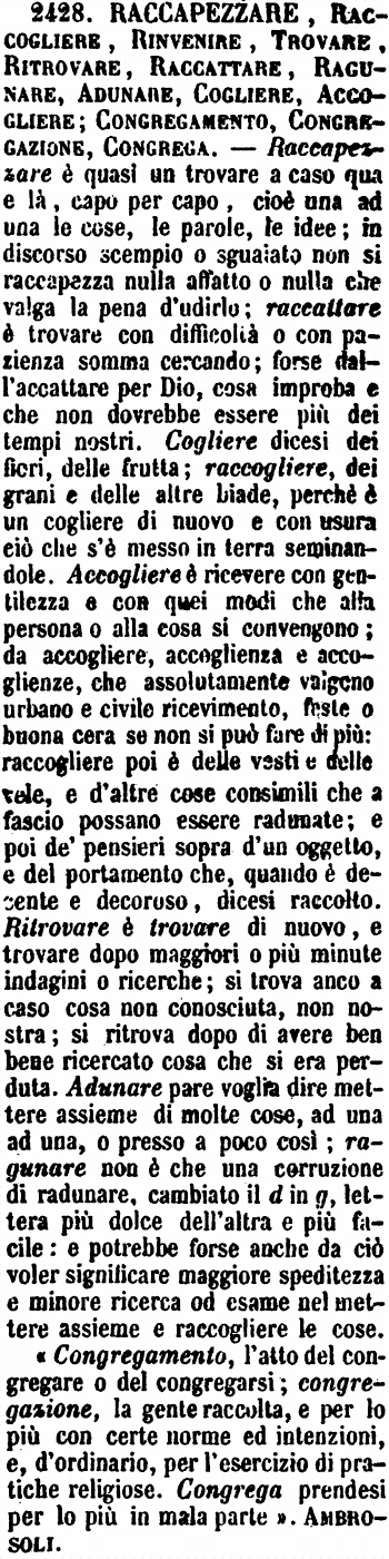 | Raccapezzare, Raccogliere, Rinvenire, Trovare, Ritrovare, Raccattare, Ragunare, Adunare, Cogliere, Accogliere; Congregamento, Congregazione, Congrega - Raccapezzare è quasi un trovare a caso qua e là, capo per capo, cioè una ad una le cose, le parole, le idee; in discorso scempio o sguaiato non si raccapezza nulla affatto o nulla che valga la pena d'udirlo; raccattare è trovare con difficoltà o con pazienza somma cercando; forse dall'accattare per Dio, cosa improba e che non dovrebbe essere più dei tempi nostri. Cogliere dicesi dei fiori, delle frutta; raccogliere, dei grani e delle altre biade, perchè è un cogliere di nuovo e con usura ciò che s'è messo in terra seminandole. Accogliere è ricevere con gentilezza e con quei modi che alla persona o alla cosa si convengono; da accogliere, accoglienza e accoglienze, che assolutamente valgono urbano e civile ricevimento, feste o buona cera se non si può fare di più: raccogliere poi è delle vesti e delle vele, e d'altre cose consimili che a fascio possano essere radunate; e poi de' pensieri sopra d'un oggetto, e del portamento che, quando è decente e decoroso, dicesi raccolto. Ritrovare è trovare di nuovo, e trovare dopo maggiori o più minute indagini o ricerche; si trova anco a caso cosa non conosciuta, non nostra; si ritrova dopo di avere ben bene ricercato cosa che si era perduta. Adunare pare voglia dire mettere assieme di molte cose, ad una ad una, o presso a poco così; ragunare non è che una corruzione di radunare, cambiato il d in g, lettera più dolce dell'altra e più facile: e potrebbe forse anche da ciò voler significare maggiore speditezza e minore ricerca od esame nel mettere assieme e raccogliere le cose.