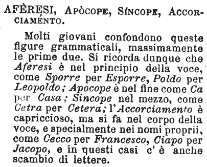 | Aferesi, Apocope, Sincope, Accorciamento - Molti giovani confondono queste figure grammaticali, massimamente le prime due. Si ricorda dunque che Aferesi è nel principio della voce, come Sporre per Esporre, Poldo per Leopoldo; Apocope è nel fine come Ca per Casa; Sincope nel mezzo, come Cetra per Cetera; l'Accorciamento è capriccioso, ma si fa nel corpo della voce, e specialmente nei nomi proprii, come Cecco per Francesco, Ciapo per Jacopo, e in questi casi c'è anche scambio di lettere. [immagine] |