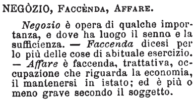 | Negozio, Faccenda, Affare - Negozio è opera di qualche importanza, e dove ha luogo il senno e la sufficienza. - Faccenda dicesi per lo più delle cose di abituale esercizio. - Affare è faccenda, trattativa, occupazione che riguarda la economia, il mantenersi in istato; ed è più o meno grave secondo il soggetto. [immagine] |