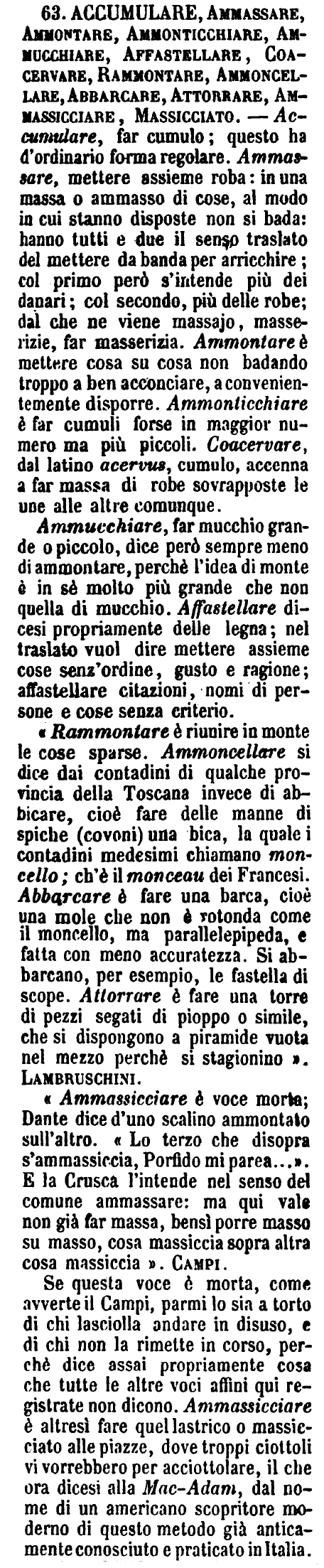 | Accumulare, Ammassare, Ammontare, Ammonticchiare, Ammucchiare, Affastellare, Coacervare, Rammontare, Ammoncellare, Abbarcare, Attorrare, Ammassicciare, Massicciato - Accumulare, far cumulo; questo ha d'ordinario forma regolare. Ammassare, mettere assieme roba: in una massa o ammasso di cose, al modo in cui stanno disposte non si bada: hanno tutti e due il senso traslato del mettere da banda per arricchire; col primo però s'intende più dei danari; col secondo, più delle robe; dal che ne viene massajo, masserizie, far masserizia. Ammontare è mettere cosa su cosa non badando troppo a ben acconciare, a convenientemente disporre. Ammonticchiare è far cumuli forse in maggior numero ma più piccoli. Coacervare, dal latino acervus, cumulo, accenna a far massa di robe sovrapposte le une alle altre comunque.