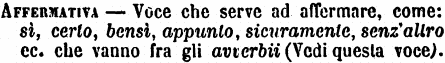 | Affermativa - Voce che serve ad affermare, come: sì, certo, bensì, appunto, sicuramente, senz'altro ec. che vanno fra gli avverbii (Vedi questa voce). [immagine] |