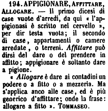 | Appigionare, Affittare, Allogare - Il primo dicesi di case vuote d'arredi, da qui «l'appigionasi è scritto nel cervello», per dir testa vuota; il secondo di case, appartamenti o camere arredate, o terreni. Affittare può dirsi del dare o del prendere in affitto; appigionare è soltanto dare a pigione.