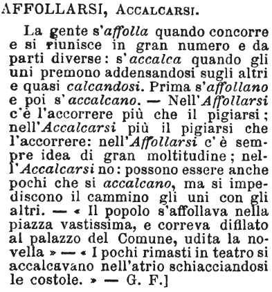 | Affollarsi, Accalcarsi - La gente s'affolla quando concorre e si riunisce in gran numero e da parti diverse: s'accalca quando gli uni premono addensandosi sugli altri e quasi calcandosi. Prima s'affollano e poi s'accalcano. - Nell'Affolarsi c'è l'accorrere più che il pigiarsi; nell'Accalcarsi più il pigiarsi che l'accorrere: nell'Affollarsi c'è sempre idea di gran moltitudine; nell'Accalcarsi no: possono essere anche pochi che si accalcano, ma si impediscono il cammino gli uni con gli altri. - «Il popolo s'affollava nella piazza vastissima, e correva difilato al palazzo del Comune, udita la novella» - «I pochi rimasti in teatro si accalcavano nell'atrio schiacciandosi le costole.» - G. F.] [immagine] |