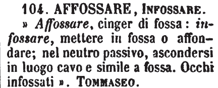 | Affossare, Infossare - «Affossare, cinger di fossa: infossare, mettere in fossa o affondare; nel neutro passivo, ascondersi in luogo cavo e simile a fossa. Occhi infossati». Tommaseo. [immagine] |