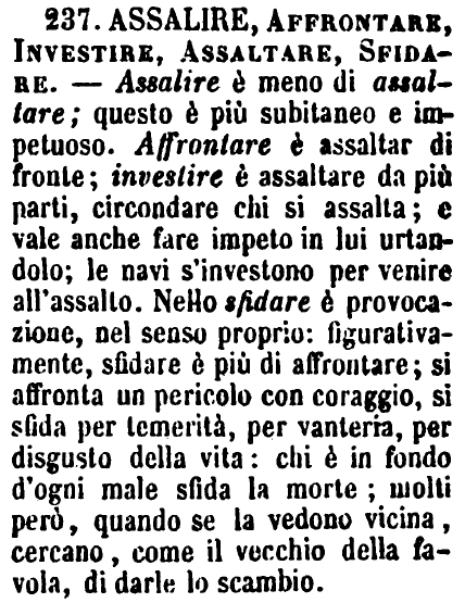 | Assalire, Affrontare, Investire, Assaltare, Sfidare - Assalire è meno di assaltare; questo è più subitaneo e impetuoso. Affrontare è assaltar di fronte; investire è assaltare da più parti, circondare chi si assalta; e vale anche fare impeto in lui urtandolo; le navi s'investono per venire all'assalto. Nello sfidare è provocazione, nel senso proprio: figurativamente, sfidare è più di affrontare; si affronta un pericolo con coraggio, si sfida per temerità, per vanteria, per disgusto della vita: chi è in fondo d'ogni male sfida la morte; molti però, quando se la vedono vicina, cercano, come il vecchio della favola, di darle lo scambio. [immagine] |