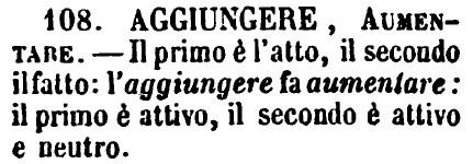 | Aggiungere, Aumentare - Il primo è l'atto, il secondo il fatto: l'aggiungere fa aumentare: il primo è attivo, il secondo è attivo e neutro. [immagine] |