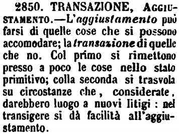 | Transazione, Aggiustamento - L'aggiustamento può farsi di quelle cose che si possono accomodare; la transazione di quelle che no. Col primo si rimettono presso a poco le cose nello stato primitivo; colla seconda si trasvola su circostanze che, considerate, darebbero luogo a nuovi litigi: nel transigere si dà facilità all'aggiustamento. [immagine] |